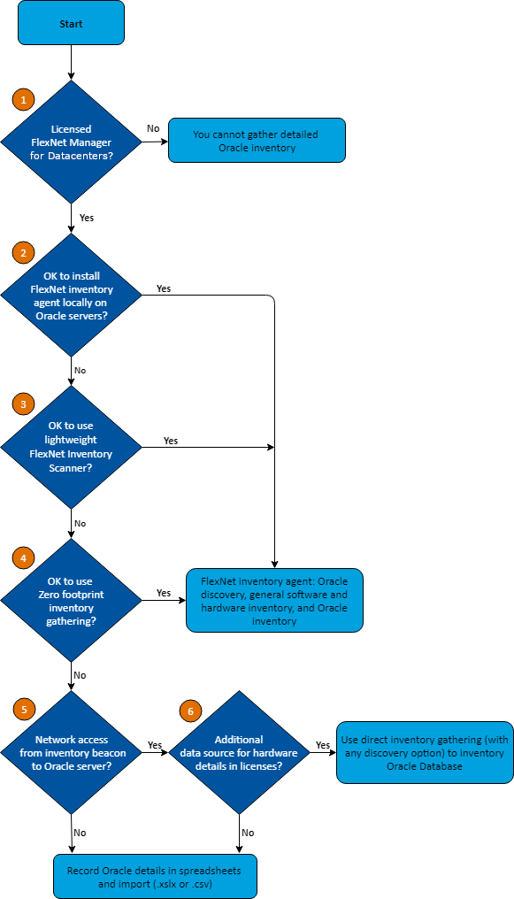 - For FlexNet inventory gathering, the direct method does not provide sufficient information to calculate consumption for all Oracle licenses (such as Oracle Named User Plus and Processor-based licenses), because these either require knowledge about the licensing of other Oracle options on the same server, or require additional details about the hardware that the database instance is running on. Therefore to use direct inventory gathering successfully for Oracle license management, you must have an additional source of inventory data both for the Oracle server hardware, and for any additional Oracle software (other than Oracle Database itself) that you want to manage. If you do not have these auxiliary data sources, you could revert to manual management of your data in spreadsheets, and importing those. (However, since spreadsheet maintenance is generally an unattractive option, you may wish to reconsider an alternative from earlier in the flowchart!)