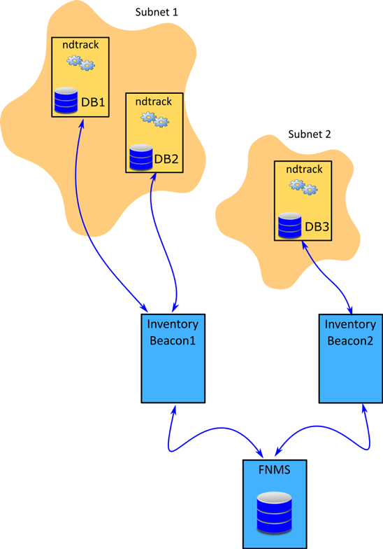 The above diagram shows three database servers, two in Subnet1 and one in Subnet2. The Subnet1 is assigned to Inventory Beacon1 and Subnet2 is assigned to Inventory Beacon2. Each inventory beacon can connect to the Oracle server(s) in its assigned subnet. All the prerequisites outlined in Zero-footprint Collection of Oracle Inventory are satisfied.